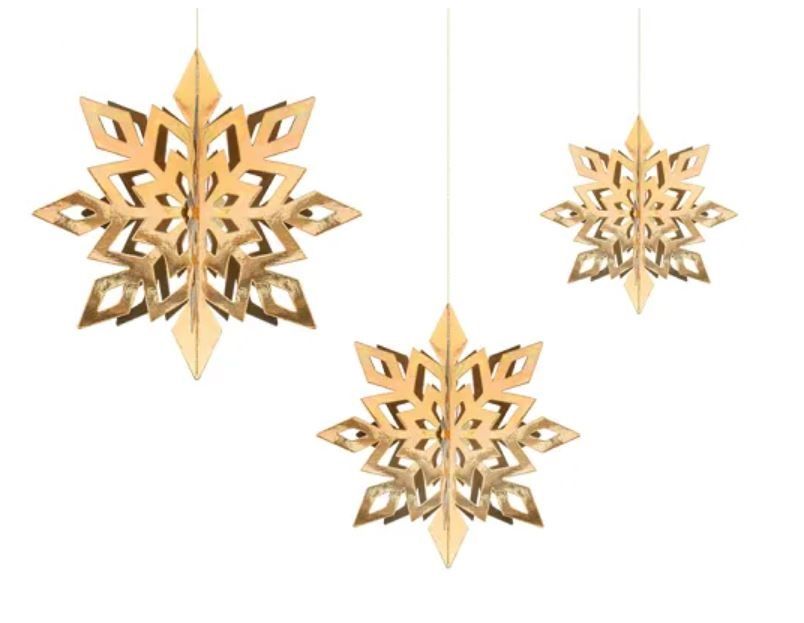 Dekors Sniegpārslas 3D zelta d15/20/25cm 1/6gab papīra NY